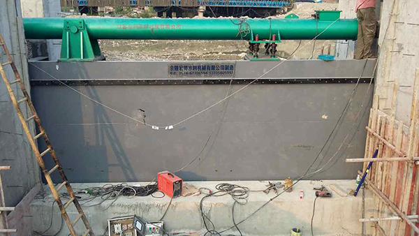 先把下層柵體(鏈條、齒耙組合)供應商鋼壩閘門用汽車吊起來并運送到孔中,通過在上游對柵欄體施加一定的水平力,使其與鉛垂垂面傾斜15°,沿著軌道下降,通過清洗機鎖定了鎖定裝置。